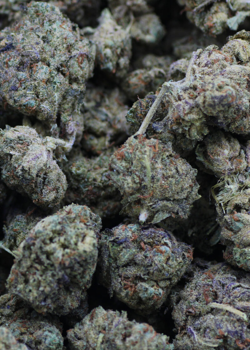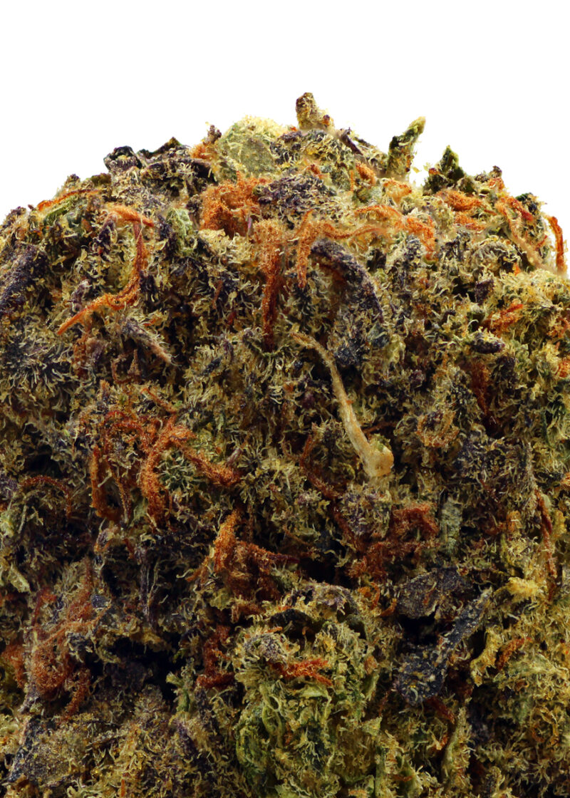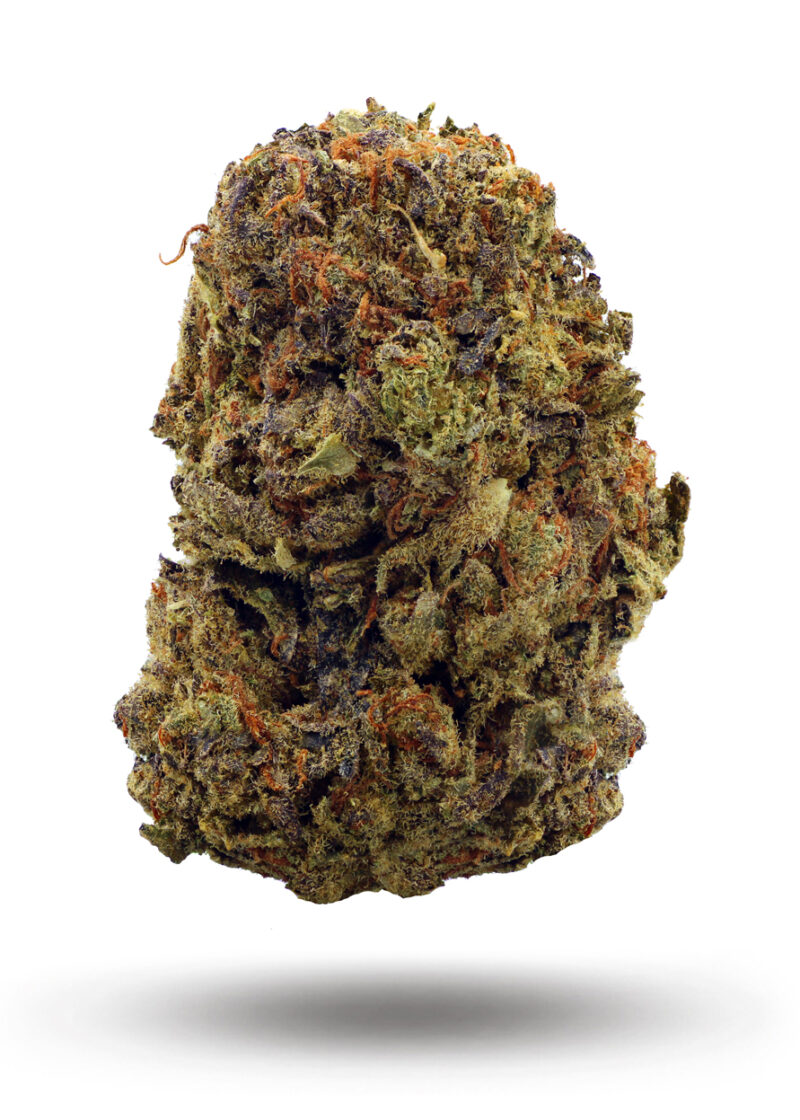 There is some dispute over the true parents of this indica-dominant award winner: Some sources claim they’re F1Durb (an indica-dominant descendant of Durban Poison) and Florida OG (a little known indica). Others say they’re Blueberry and Girl Scout Cookies. Whatever its origins, Blue Cookies has a sativa/indica ratio of between 10:90 and 30:70. That makes for a potent body buzz, although the sativa genes also provide an energized cerebral effect. Use this strain to treat anxiety, low mood, headaches, irritability, and persistent physical pain. Blue Cookies won the Cannabis Cup in the medical hybrid category based largely on its whopping THC content, measured at more than 28%. The record holder is still less than 30%, which means this strain is one of the strongest on the market. CBD, on the other hand, makes up less than 2% of this plant’s cannabinoid content, so Blue Cookies shouldn’t be used as an exclusive treatment for seizures or other health problems that respond to CBD. As the name suggests, this strain’s dense nugs have a dark bluish tint, as well as a thick layer of resinous crystals on the surface. The flavor is sweet and smooth, with notes of orange, earth, and candy. The smell is sweet and reminiscent of cookies. Blue Cookies is popular on the West Coast but much harder to find in other parts of the United States.