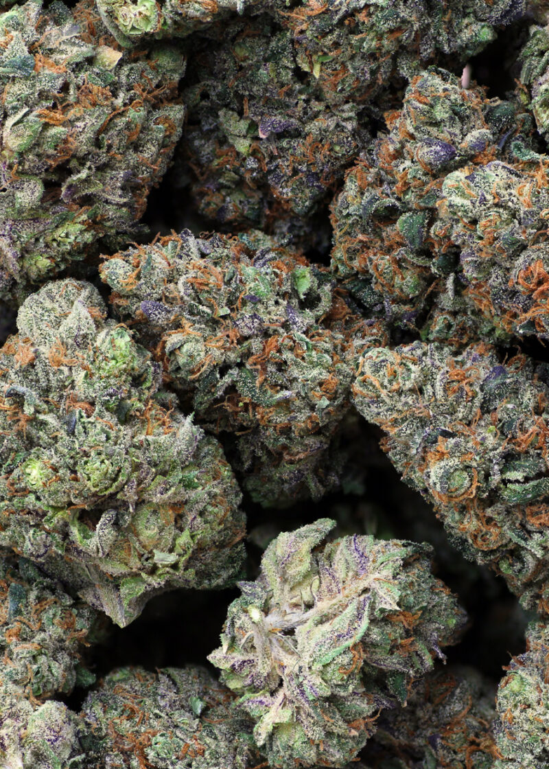 Clout Face is an indica dominant hybrid strain (70% indica/30% sativa) created through crossing the classic Face Off OG X Cherry Pie strains. If you’re after a super tasty bud with a heavily potent, “comfy” high, Clout Face is the perfect indica to take you anywhere you want to be. The flavor of Clout Face might just be another reason for its name, with brag-worthy flavors of sweet fruity cherries, doughy pastries and citrusy pine galore. The aroma is nothing to sneeze at either, with a fruity cherry overtone accented by spicy earthiness and woody pine. The Clout Face high is one that will have you ready to kick back and settle down for the evening, with soothing, comfortable effects that will hit you from head to toe. Your mind will be lifted into a place of happiness that is hazy and sedative at times. Your body will be hit with a creeping physical high that will eventually leave you feeling totally relaxed from head to toe and ready to get to sleep. Combined with its insanely high 27-31% average THC level, these effects give Clout Face an edge in treating chronic pain, chronic stress, muscle spasms or cramps, insomnia and depression. This bud has oversized and dense, triangle-shaped emerald-green nugs with dark purple leaves, thick orange hairs and chunky, golden-white trichomes.