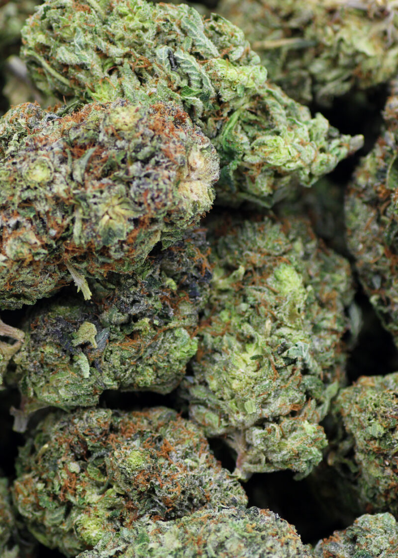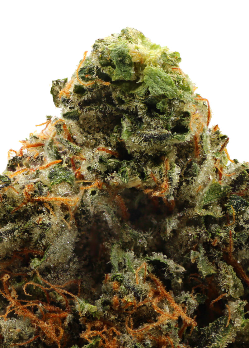 Death Valley OG is a rare indica dominant hybrid strain created through crossing the potent Deathstar X SFV OG Kush strains. This potent bud packs a heavy-hitting high that’s fueled by a massive 24-34% average THC level, making it ideal for the experienced user. You’ll feel a lifted onset a few minutes after your last toke, filling your mind with a sense of clear-headed energy that won’t affect anxiety in the slightest. A super strong, sedative body high comes next, leaving you hopelessly couch-locked and immovable for hours on end without affecting your mental energy level. Thanks to these effects and its super high THC level, Death Valley OG is often chosen to treat conditions such as chronic pain, loss of appetite or nausea, and chronic stress. Death Valley OG has a sweet woody pine flavor with hints of lemony herbs upon exhale. The aroma is very earthy and herbal with a spicy lemon overtone that’s slightly pungent and skunky as the nugs are burned. This bud has oversized spade-shaped forest green nugs with long thin orange hairs and a coating of sparse amber crystal trichomes.