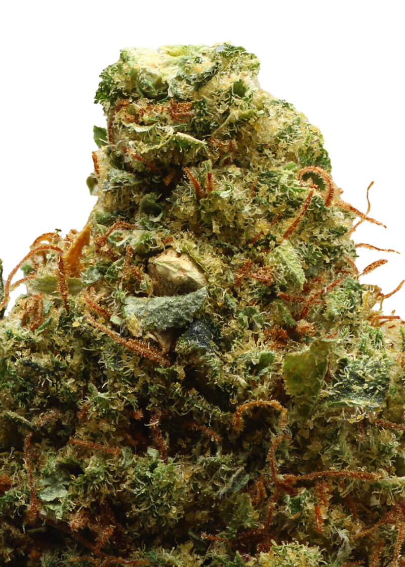 Fruit Pie is a slightly indica dominant hybrid strain (60% indica/40% sativa) created through crossing Fruitbound X Pie-95. If you love either of its parent strains, you’ll be a huge fan of Fruit Pie. This bud packs a sweet and fruity berry candy flavor with hints of delicious ripe cherries and nutty cookie. The aroma is just as delicious, with a punch of sharp mint to it, too, as the nugs are broken apart and burned away. The Fruit Pie high is just as intoxicating as its flavor, with lifted effects that energize the mind and relax the body. You’ll feel a boost of euphoria that fills you with a sense of focused creative energy and wipes out any negative or racing thoughts immediately. As your mind flies higher and higher, your body will begin to settle into a deeply relaxing and calming state that has you feeling kicked back in no time at all without too much sedation. With these effects and its high 20-25% average THC level, Fruit Pie is often chosen to treat conditions such as chronic fatigue, depression, chronic pain, mood swings, chronic stress and insomnia. This bud has heart-shaped bright neon green nugs with golden amber undertones with thin orange hairs and a coating of frosty golden amber crystal trichomes.