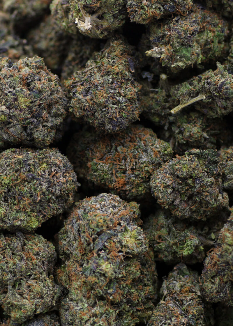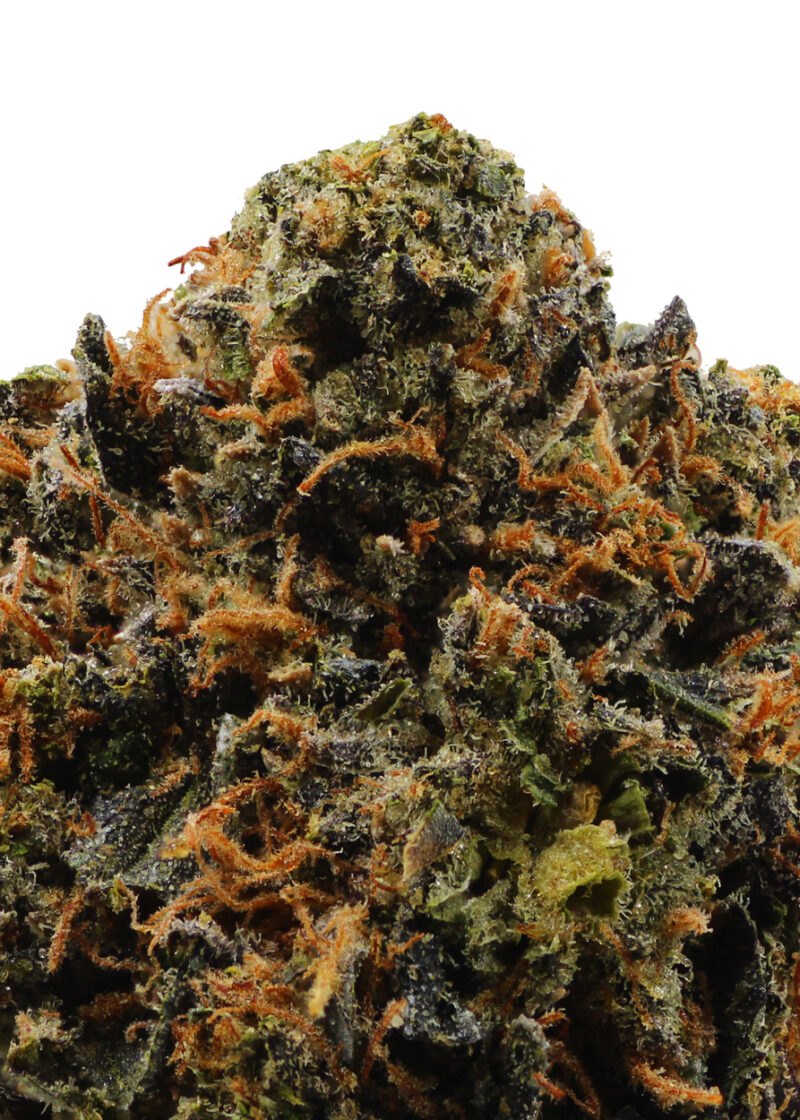 Gas Chamber is a rare indica dominant hybrid strain (70% indica/30% sativa) created through crossing the classic Gas Mask X Green Ribbon BX strains. This bud’s name says it all in the smell department – Gas Chamber packs a super sour gassy aroma that has a touch of sour citrus and heavy pungency that can definitely fill a room with its heavy stench. The flavor is on the lighter side, with an herbal earthy overtone that’s accented by sweet lemon and sour diesel upon exhale. The Gas Chamber high is just as expanding as the flavor, with long-lasting effects that end in a heavy cerebral stone. You’ll feel a light lift of the spirits at the onset of the high, filling your mind with a sense of hazy euphoria and ease. This effect will quickly turn stoney, leaving you spacey and out of focus. A relaxing body high accompanies this heady state, keeping you totally relaxed and anchored to the world below. Thanks to these effects and its high 21-23% average THC level, Gas Chamber is often chosen to treat those suffering from conditions such as chronic pain, depression, nausea or appetite loss, migraines or headaches, and chronic fatigue. This bud has small rounded olive green nugs with purple undertones, thin orange hairs, and a coating of frosty purple-tinted crystal trichomes.