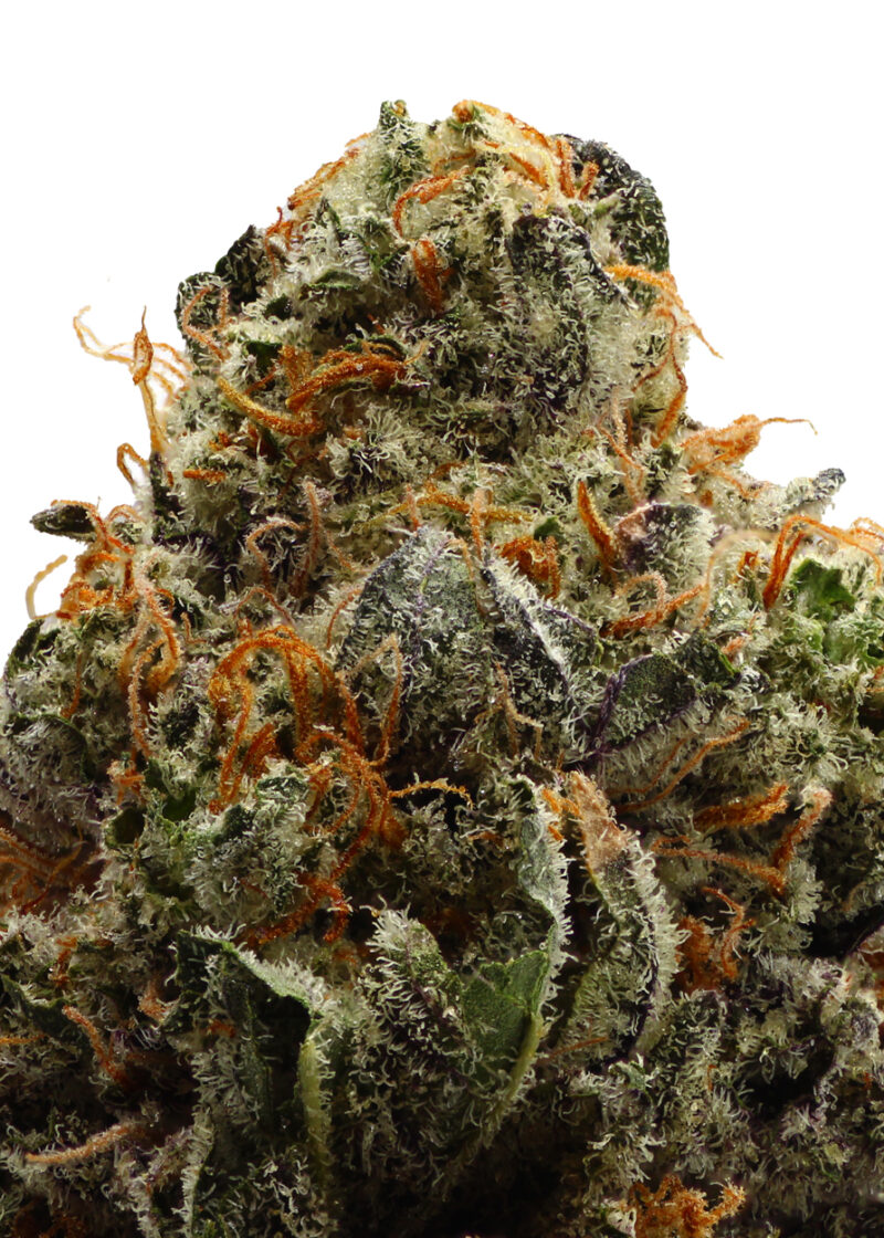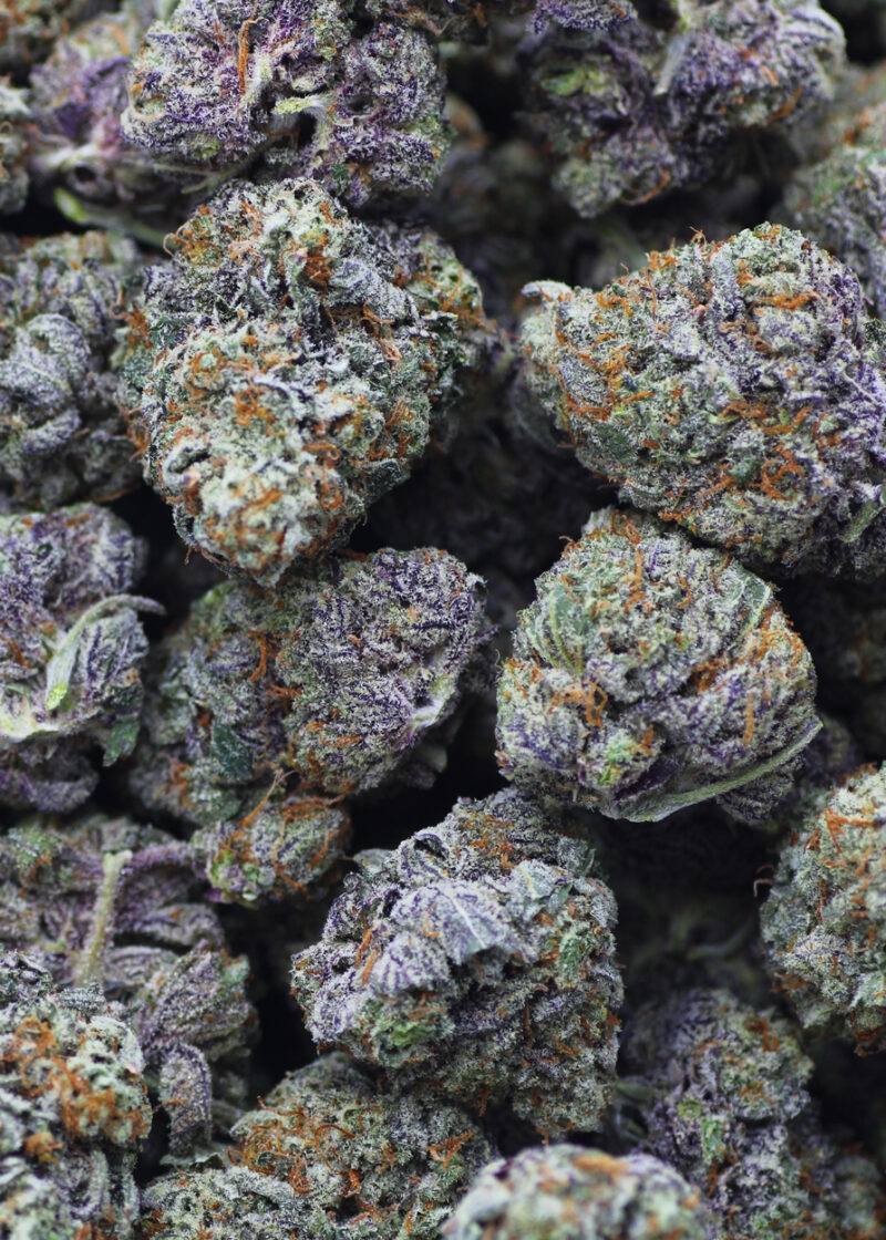 Golden Grapes, also known as “Golden Grape,” is an indica dominant hybrid strain (70% indica/30% sativa) created through crossing the iconic Kosher Kush X Grape Pie strains. A great choice for any lover of fruity hybrids, Golden Grapes packs a delicious flavor and soothing nighttime high that will leave you feeling amazing. Much like its name suggests, Golden Grapes has a sweet and fruity grape berry flavor with a light hint of woody flowers to it, too. The aroma is very similar, with a fruity grape overtone accented by earthy kush, woody pine and spicy flowers. The Golden Grapes high will settle in a few minutes after your final exhale, slowly washing over the brain with a sense of happy relaxation. You’ll feel calm from head to toe, free of any physical aches or pains to speak of. At the same time, a sense of lifted creativity will settle into your brain, infusing you with an artistic sense that also provides a substantial mood boost. Thanks to these effects and its super high 30% + average THC level, Golden Grapes is said to be perfect for treating conditions such as mood swings or depression, chronic stress or anxiety and insomnia or nightmares. This bud has grape-shaped heavy and dense emerald green nugs with purple undertones, vivid orange hairs and a coating of tiny, purple-tinted white crystal trichomes.