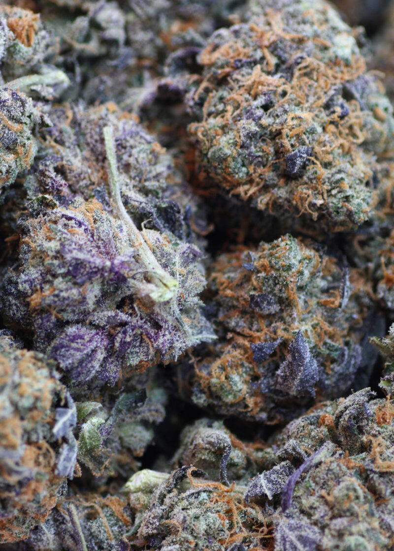 Humble Pie is a rare slightly indica dominant hybrid strain (65% indica/35% sativa) created through crossing the infamous Cherry Pie x Grandpa’s Breath strains. Ready to take a bite of this pie? One taste of its super sweet fruity berry and sour citrus taste and you’ll be begging for more. The aroma follows this same profile, with a heavy herbal effect that’s accented by spicy earth and rich ripe cherries and grapes. The Humble Pie high is just as delicious as the flavor, with lifting effects that will have your mood flying high while keeping your body relaxed for hours on end. You’ll the euphoria hit almost as soon as you exhale with a soaring effect, erasing any negative or racing thoughts and replacing them with heady happiness and a touch of creativity. The relaxing physical high comes next, creeping up on you before dropping you into a state of pure calm and ease. With these effects and its high 15-23% average THC level and 1% CBD level, Humble Pie is often chosen to treat those suffering from conditions such as chronic stress depression, chronic fatigue, muscle spasms or cramps and chronic pain. This bud has small grape-shaped olive green nugs with deep purple undertones, vivid orange hairs and a coating of thick and frosty purple-tinted white crystal trichomes.