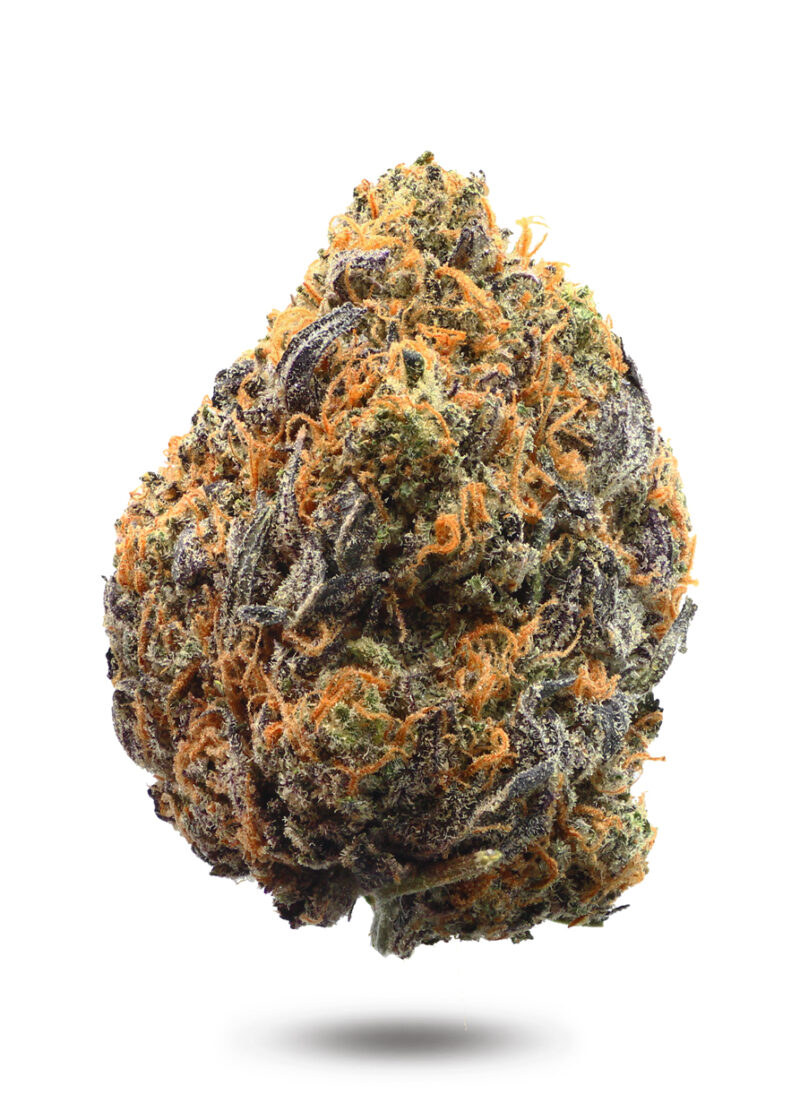 Humble Pie is a rare slightly indica dominant hybrid strain (65% indica/35% sativa) created through crossing the infamous Cherry Pie x Grandpa’s Breath strains. Ready to take a bite of this pie? One taste of its super sweet fruity berry and sour citrus taste and you’ll be begging for more. The aroma follows this same profile, with a heavy herbal effect that’s accented by spicy earth and rich ripe cherries and grapes. The Humble Pie high is just as delicious as the flavor, with lifting effects that will have your mood flying high while keeping your body relaxed for hours on end. You’ll the euphoria hit almost as soon as you exhale with a soaring effect, erasing any negative or racing thoughts and replacing them with heady happiness and a touch of creativity. The relaxing physical high comes next, creeping up on you before dropping you into a state of pure calm and ease. With these effects and its high 15-23% average THC level and 1% CBD level, Humble Pie is often chosen to treat those suffering from conditions such as chronic stress depression, chronic fatigue, muscle spasms or cramps and chronic pain. This bud has small grape-shaped olive green nugs with deep purple undertones, vivid orange hairs and a coating of thick and frosty purple-tinted white crystal trichomes.