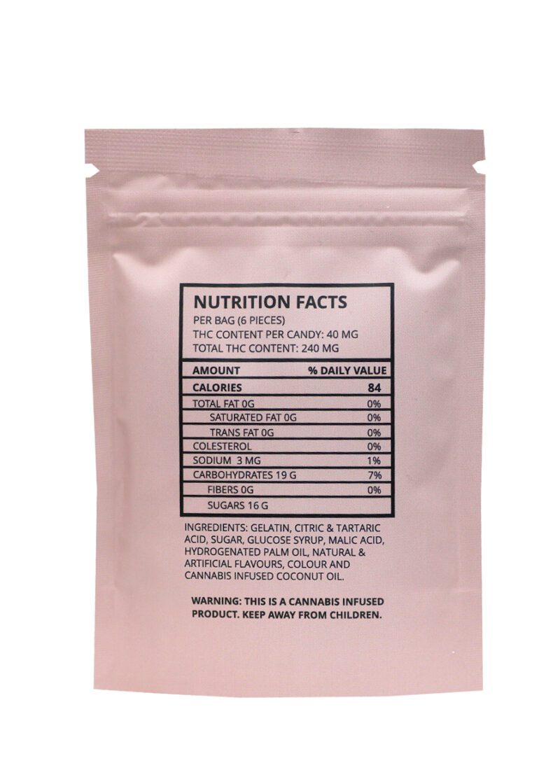 INGREDIENTS: CORN STARCH, CITRIC & TARTARIC ACID, SUGAR, GLUCOSE SYRUP, SODIUM CITRATE, LACTIC ACIDE, NATURAL & ARTIFICIAL FLAVOURS, AND CANNABIS INFUSED COCONUT OIL.