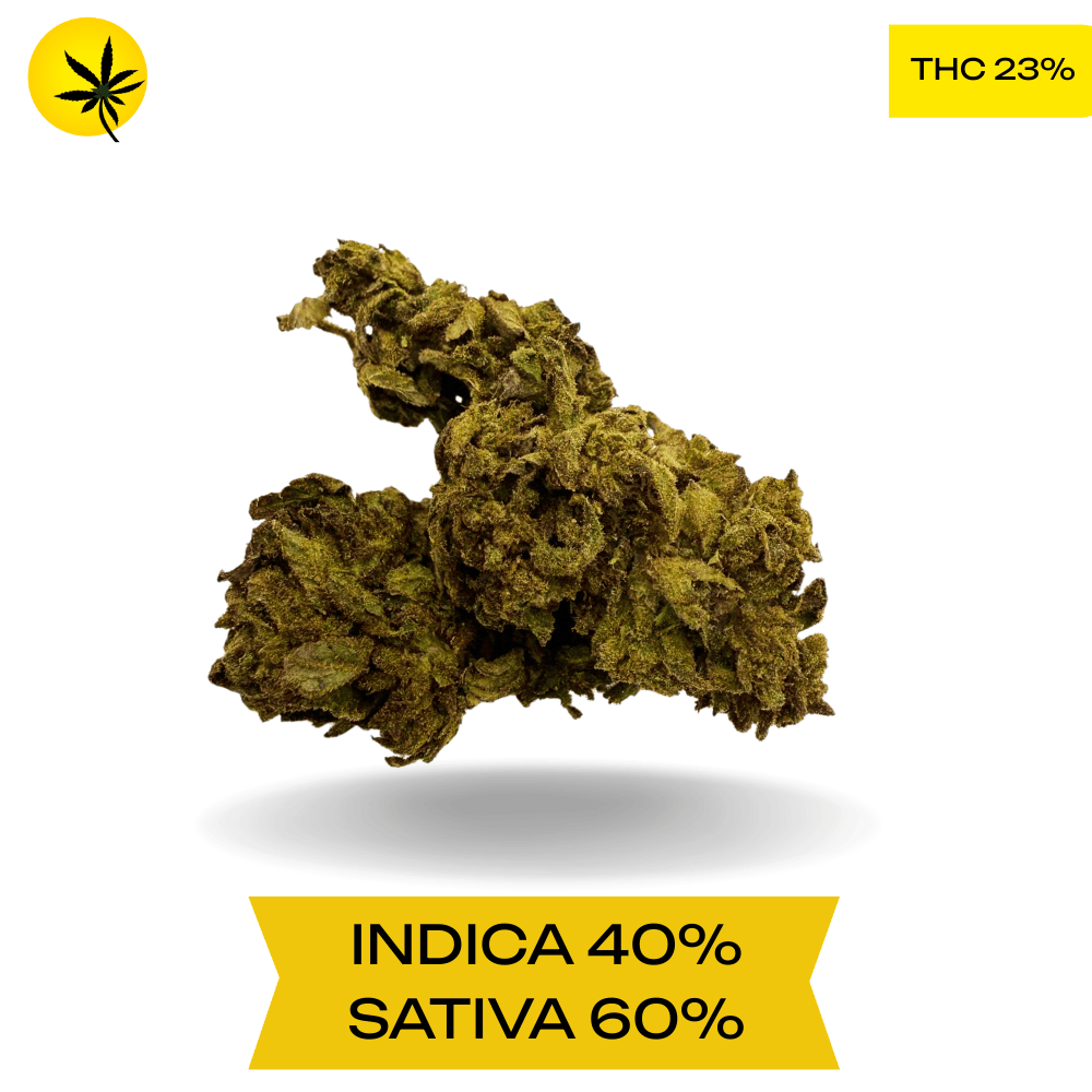 This strain holds a pretty balanced 60:40 sativa/indica ratio ( Brazil Sativa X South Indian Indica) that leads one to a cognitive driven high with a relaxing undertone. THC 23%